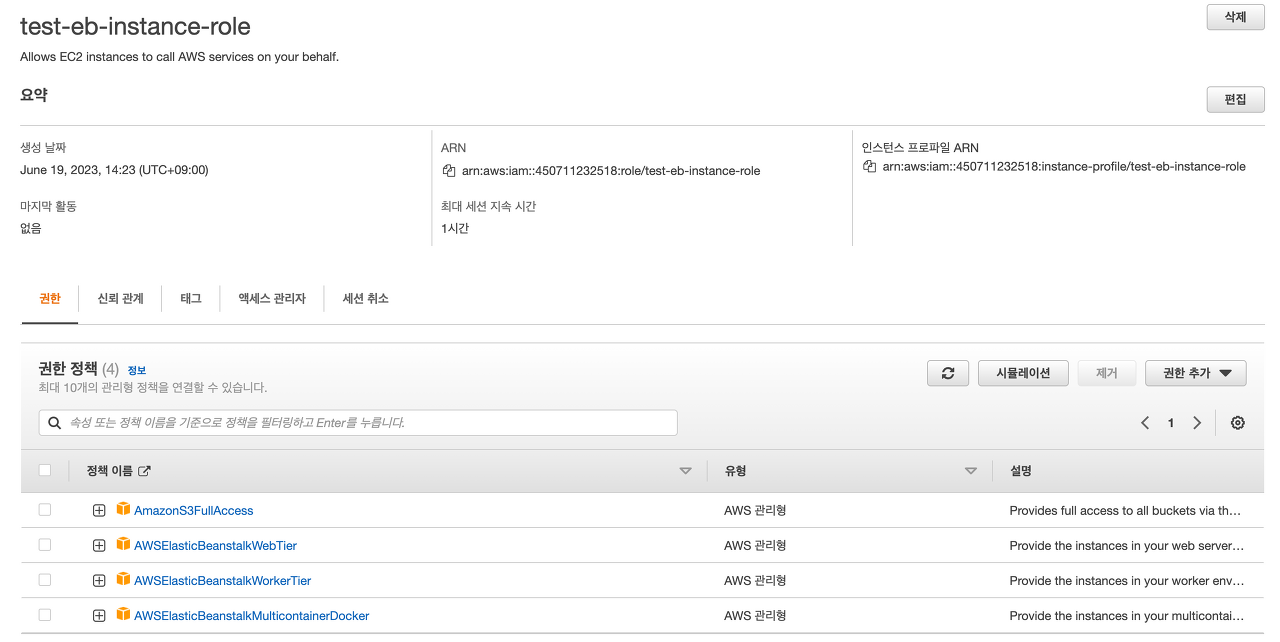 EB 환경 구성이 완료되면 EC2 인스턴스가 자동으로 생성됩니다. 이를 위해 IAM 역할이 필요합니다.