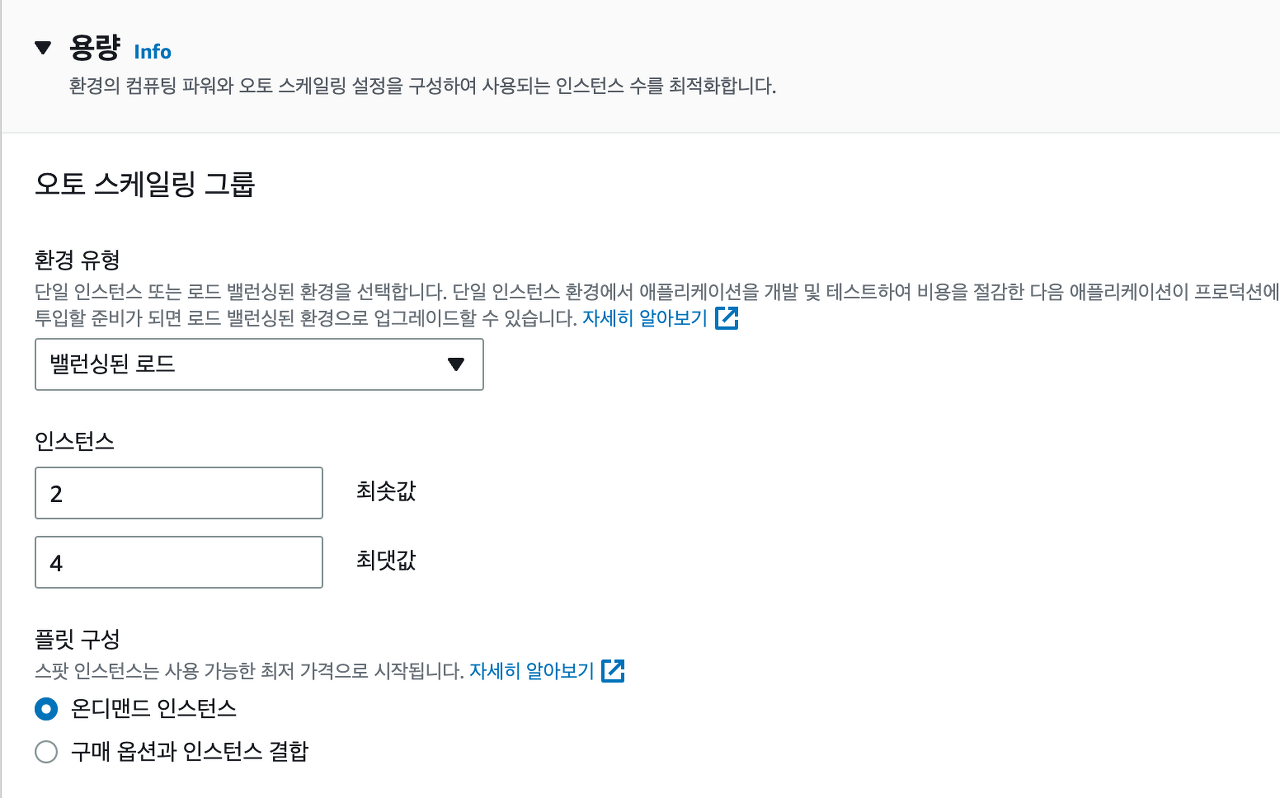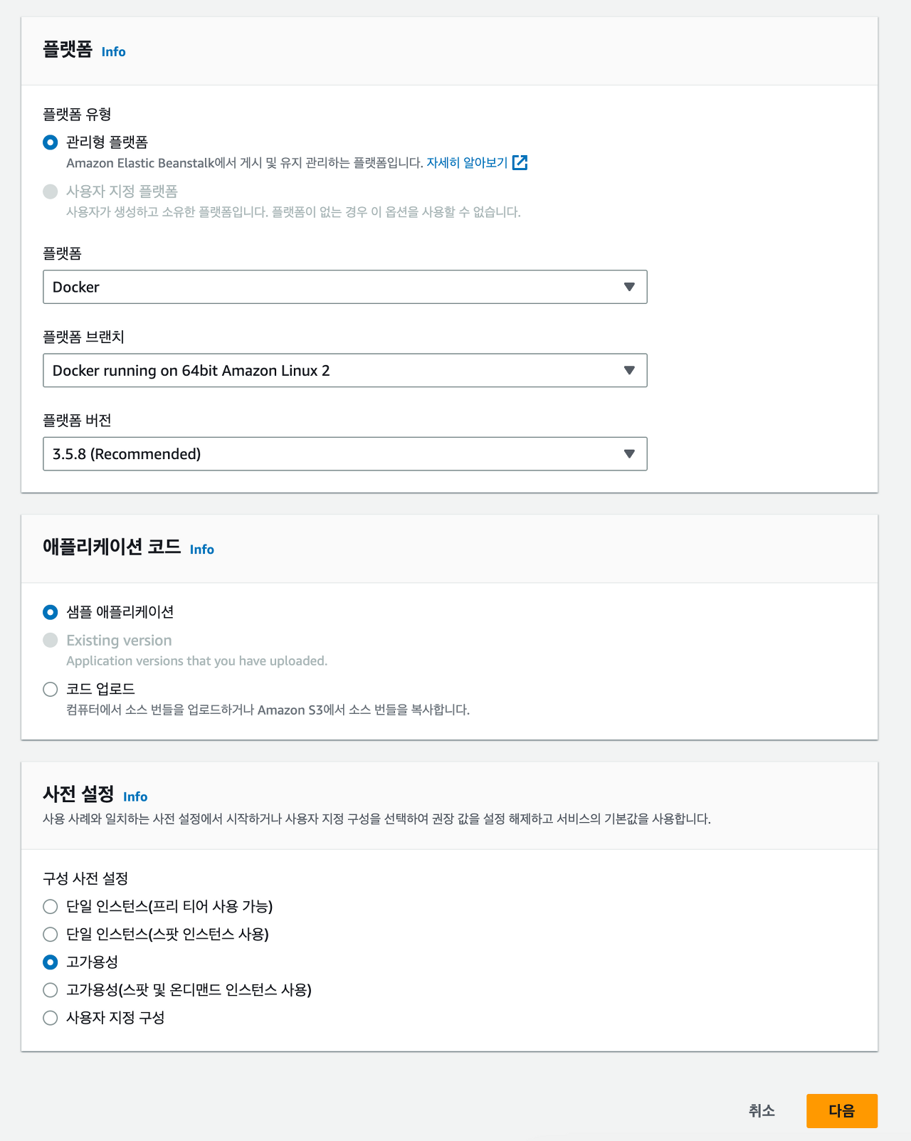 사전 설정: AutoScaling, LoadBalancer를 사용할 예정이라면 고가용성을 선택해 줍니다. 아니면 단일 인스턴스를 선택합니다.