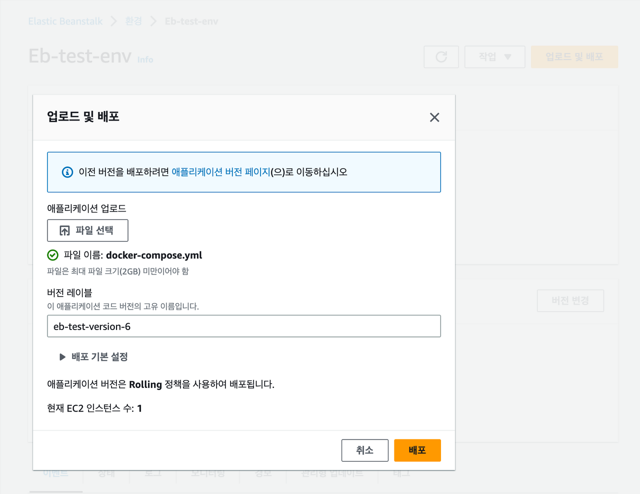 EB 환경 탭에서 업로드 및 배포를 클릭합니다.