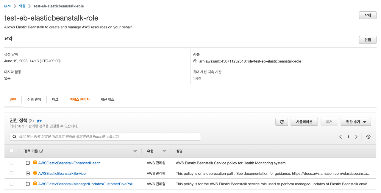 EB를 서비스로 사용하므로 담당할 IAM 역할을 부여합니다.