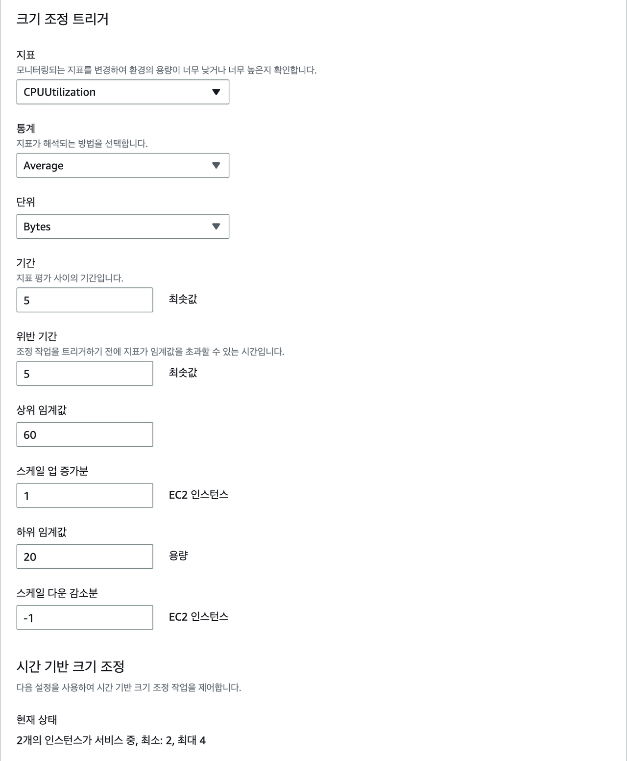 AutoScaling 설정이 간단했습니다. 눈에 보이는데로 메트릭을 설정하고, 임계값과 인스턴스 수만 정하면 적용이 가능했습니다.