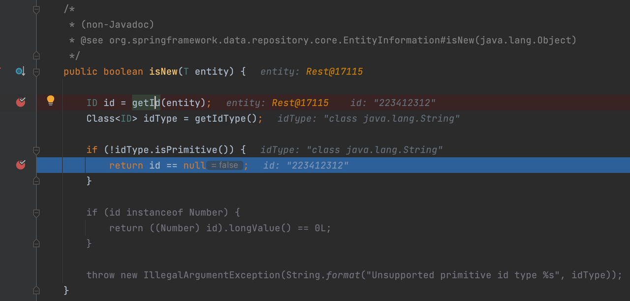 왜 isNew 메서드가 false 값을 반환했는지 디버깅했습니다.