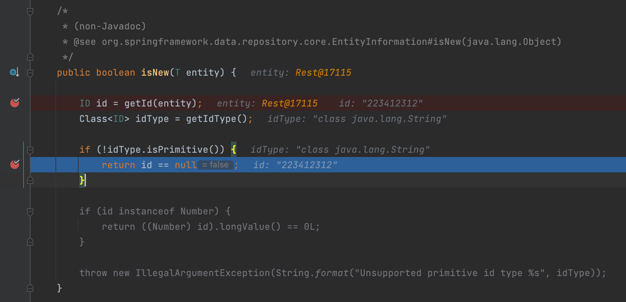 왜 isNew 메서드가 false 값을 반환했는지 디버깅했습니다.