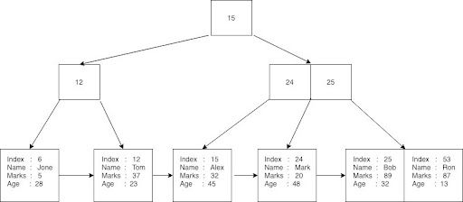 위의 예시를 보면 리프가 아닌 노드에는 레코드가 저장되지 않습니다. 각 리프노드들은 오른쪽 방향의 다음 레코드들 참조합니다. 따라서 DB는 인덱스를 이용한 이진탐색이나 리프노드만 이용해서 모든 요소를 탐색하는 순차탐색을 할 수 있습니다.