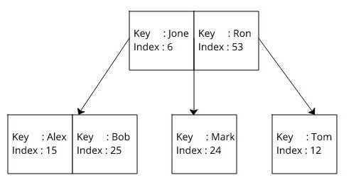 위의 예시는 리프노드를 제외한 나머지 노드를 표시한 B-Tree 입니다. 이름을 인덱스로 할 경우 PK 값이 아닌 이름으로 정렬되어 노드가 저장되는 것을 확인할 수 있습니다.