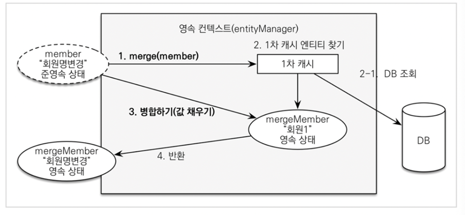 merge 메서드를 호출하면 영속 컨텍스트의 1차 캐시에 엔티티가 존재하는 지 찾고, 존재하지 않으면 DB를 조회합니다. 병합 시 저장하려는 엔티티와 1차 캐시의 엔티티가 다를 경우 UPDATE 쿼리를 호출하기 위해 사용됩니다.