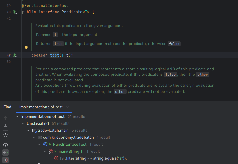 Predicate 는 추상메서드인 test 가 존재하고, boolean 타입으로 반환한다.