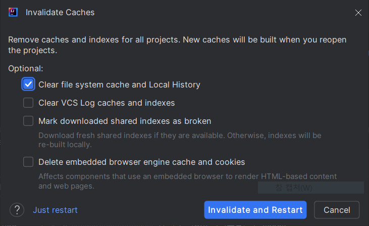 intellij file -> Invalidate caches -> clear file system cache and local history 선택 -> Invalidate and Restart 클릭