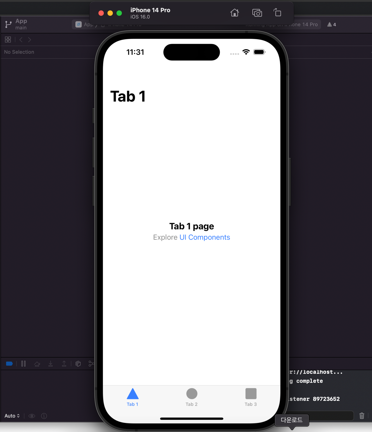 사진처럼 간단한 앱을 생성하고 시뮬레이터로 실행하는 예제입니다.